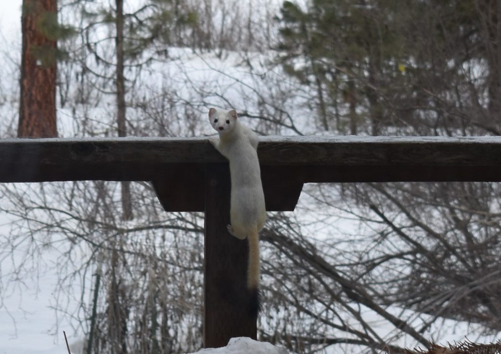 I took each of these photos near the remote Bible camp where we live and work. Sure, this is a daddy elk rather than a momma elk, the weasel is an ermine (which is what they are called when they have their white winter coat, and these are both small black bears rather than a big momma bear, but seeing the different animals that we have encountered will give you an idea about the kinds of critters that Phooey ran into during her most recent adventure!