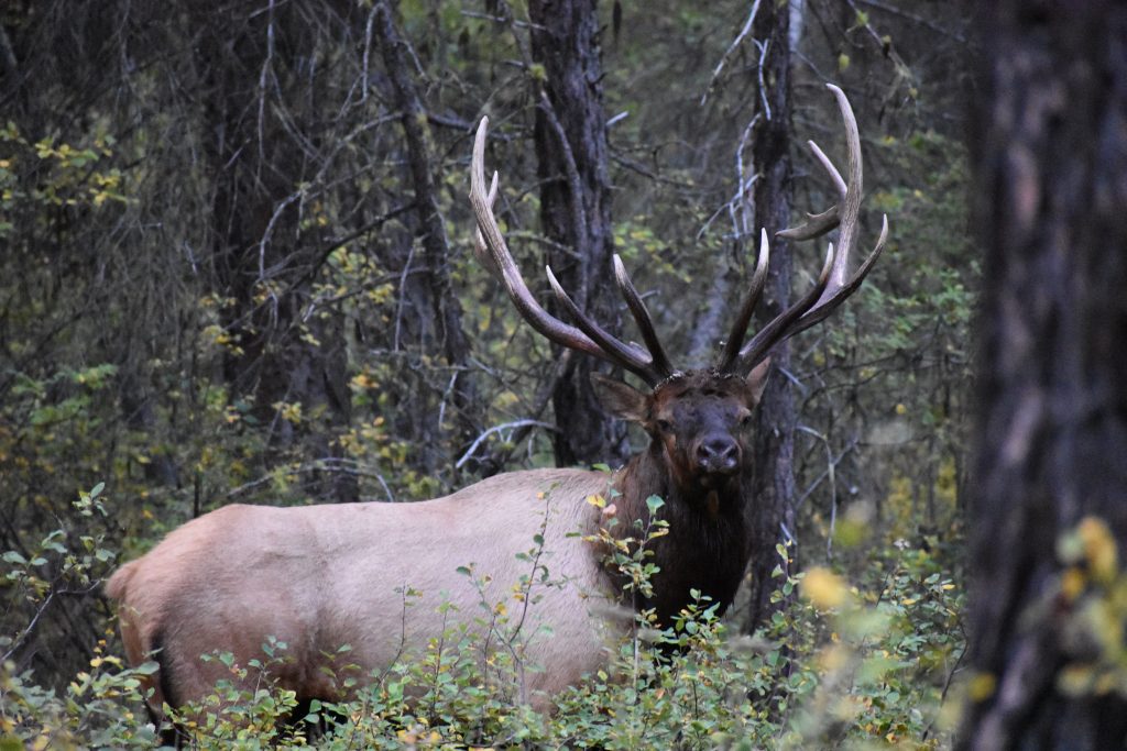 Momma Elk! My family actually does have a story about a dog that ran out to chase the elk and got into trouble. A big cow elk saw this dog zipping toward the elk herd and would have none of it! She picked that dog up by the scruff of his neck and shook him like a terrier shakes a rat. Then she tossed the dog aside. It wasn’t a small dog either! The elk below is a bull instead of a cow elk. But his picture still shows what big animals they are and how silly it would be for Phooey to run out to greet one.