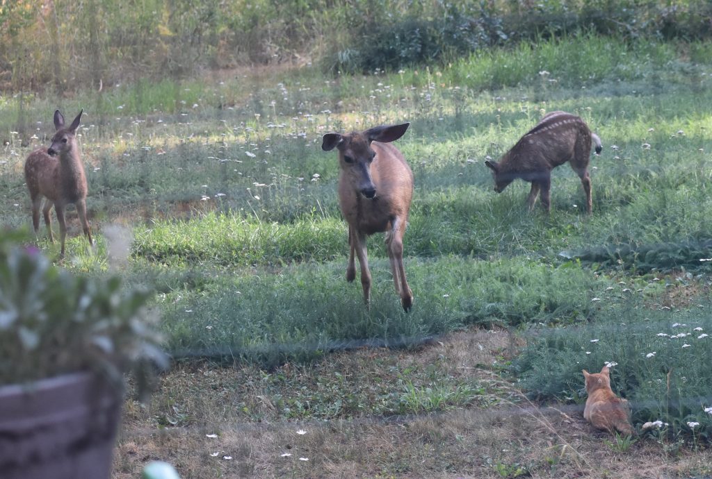 The Bear-Dear! One spring, a lovely doe decided to hide her twin fawns in the bushes surrounding the Bible camp where we live and work. It was quiet and the local cougar steers clear of us as encounters with humans make big cats nervous. Well, it was only quiet until the teen volunteers arrived for Staff Training! With the forest full of teenagers, the mother deer had a decision to make. Move her babies to another location or chase away the new invaders. She decided to stand her ground and chase off the horde of teens who had descended upon her chosen refuge. Thus, we had numerous complaints about a “Bear-Dear” or “Beer” making hard eye contact, charging, and chasing our staff. She even faced off with a local kitty cat. Since it only gets louder as the summer progresses, Momma Deer eventually moved her babies, although she did bring them to our lawn to graze at night when things were quiet. This is a different doe and fawns with a different cat (Whisper Persnickety) . . . but you get the idea.